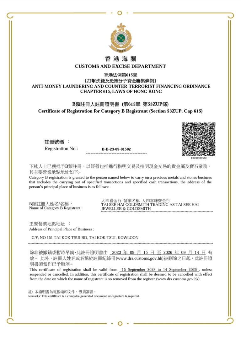 大四喜珠寶金行已在<<貴金屬及寶石交易商註冊制度>>下成功註册為 B類注册人,旨在本公司在適當地履行相關法定責任下,顧客可以安心以任何付款/收款方式與我們進行交易。