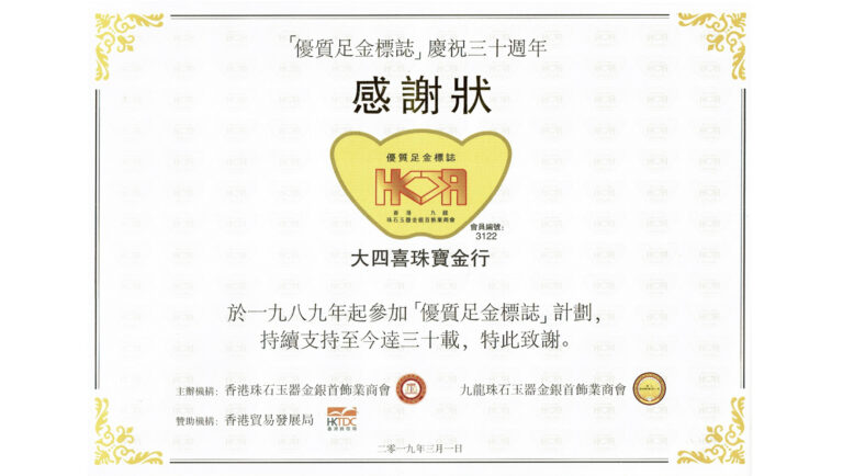 早於1989年,香港珠石玉器金銀首飾業商會與九龍珠石玉器金銀首飾業商會合辦「優質足金標誌」計劃,參加此項計劃之商號所售賣之足金金飾/產品必需達到或超過香港政府頒佈之商品說明條例下相關法令標準。商會每年均定期到店內抽取金飾樣本,交香港政府認可化驗所化驗。我們為首批參與「優質足金標誌」計劃之商號,迄今已超過三十週年,我們的足金金飾/產品自計劃來都成功通過化驗並獲頒「優質足金標誌」。我們亦在2019年於商會舉辦的「優質足金標誌」 30週年活動中獲頒感謝狀。